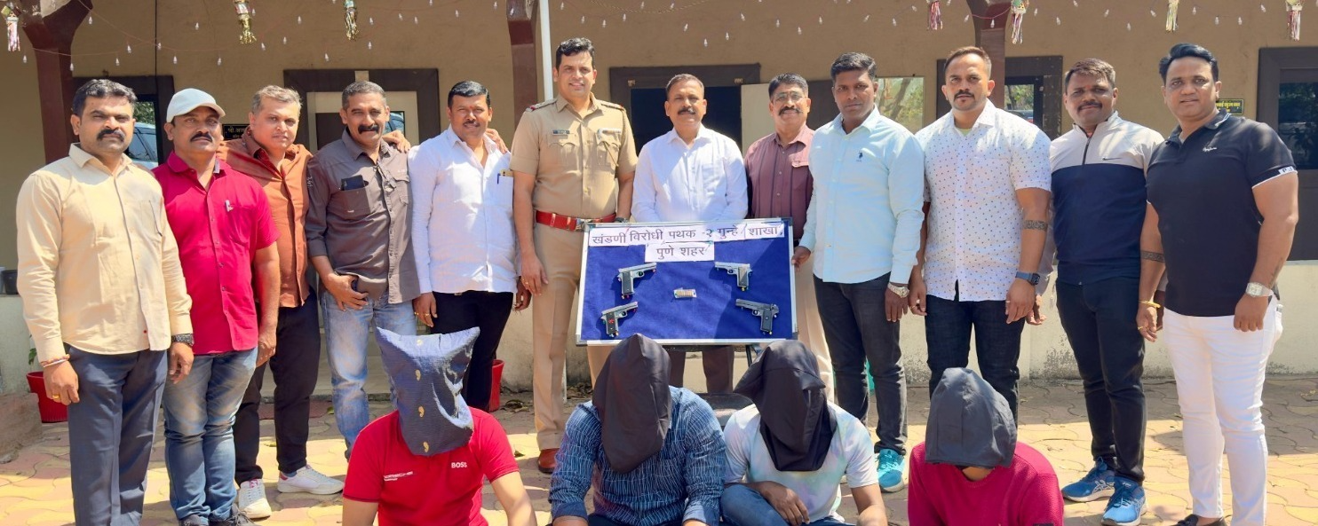 खंडणी विरोधी पथकाचे पोलीस उपनिरीक्षक गौरव देव, पोलीस अंमलदार अनिल कुसाळकर यांना खबऱ्यामार्फत आरोपीबाबत माहिती मिळाली होती. वाघोली येथील आलोवेरी सोसायटी, राजेश्वरी नगरी परिसरात एकाच घरात पटेल, पंदी, यादव राहत असून त्यांच्याकडे पिस्तूल असल्याची माहिती मिळालेली होती. पोलिसांनी याठिकाणी सापळा रचला. फ्लॅटमध्ये छापा टाकून चारही आरोपींना ताब्यात घेतले. घराची झडती घेतली असता ४ पिस्तुले आणि ८ काडतुसे असा १ लाख ६४ हजारांचा मुद्देमाल आढळून आला. आरोपींना अटक करण्यात आली.
