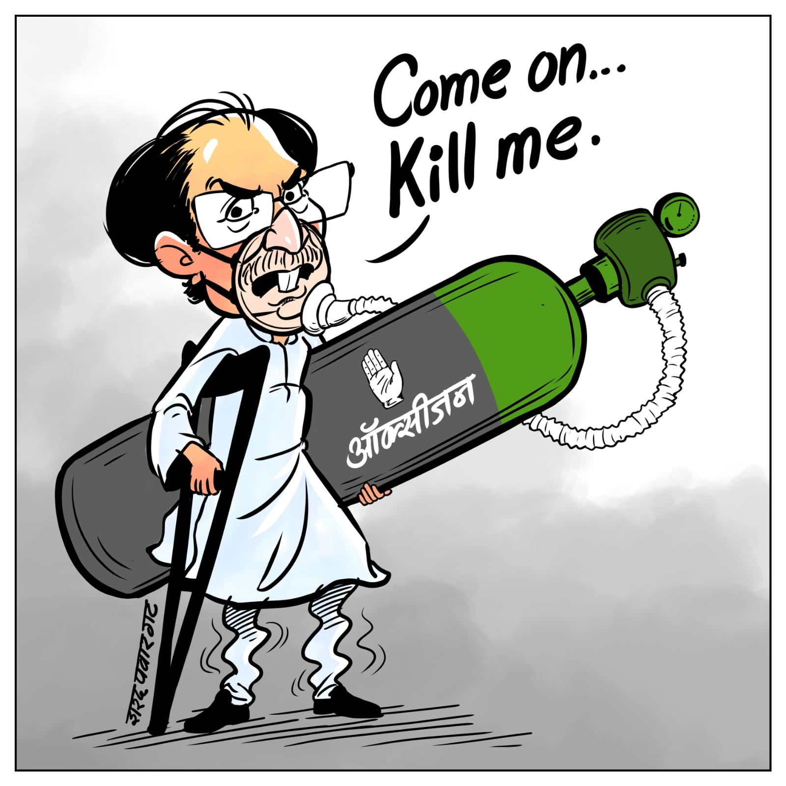 उद्धव ठाकरेंच्या वक्तव्याप्रकरणी शिंदे गटाने व्यंगचित्र रेखाटत मार्मिक भाष्य केले आहे. दोन पावलं चालताना होते सतत धडपड, वारशाच्या गप्पा आणि फुकाची बडबड, असे म्हणत शिवसेनेने उद्धव ठाकरेंचे एक व्यंगचित्र असलेला फोटो ट्वीट केला आहे. या व्यंगचित्रात उद्धव ठाकरेंच्या एका हातात शरद पवारांची कुबडी दाखवून त्यांचे पाय लटपटत असल्याचे दाखवले आहे. तर, हिरव्या रंगाच्या काँग्रेसरुपी सिलेंडरने ते श्वास घेत असल्याचे दाखवण्यात आले आहे. या व्यंगचित्राच्या खाली काँग्रेसच्या विचारांचा श्वास घेऊन आणि शरद पवारांच्या पाठबळावर उभे राहणारे उद्धव ठाकरे असा मजकूर आहे.